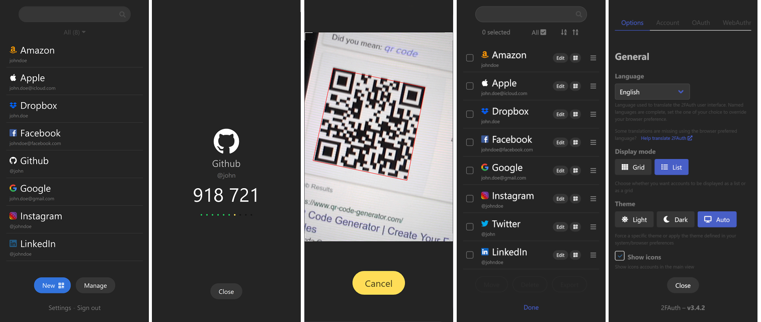 2FAuth is a web based self-hosted alternative to One Time Passcode (OTP) generators like Google Authenticator, designed for both mobile and desktop.